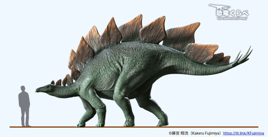 剣竜の代表であるステゴサウルスは、前足が短く後ろ脚が長いため、顔の位置が自然と低くなり、地面近くの植物を食べるのに適した体型をしています。